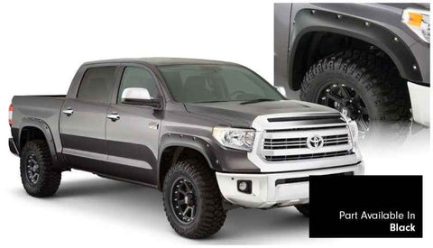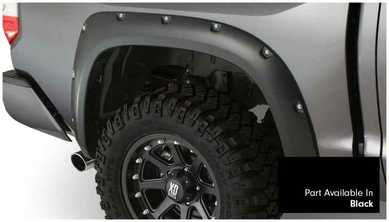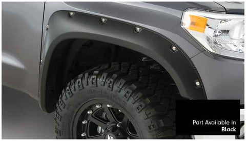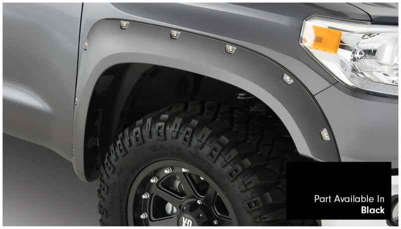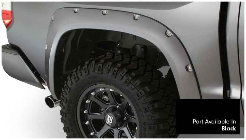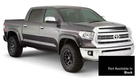 Bushwacker's rugged, iconic Pocket Style(R) Fender Flares allow for more tire coverage and more clearance for trucks and SUVs while protecting the vehicle from dirt and debris. These flares are now available pre-finished to match the paint on your new Toyota Tundra, plus they have the edge trim and stainless steel hardware pre-installed for quick and easy installation and a perfect fit-no drilling required . Made in the USA from sturdy Dura-Flex(R) 2000 material, these flares are warp-resistant and tailor made for each application. Despite their bolted-on appearance, these flares install easily without drilling for a secure fit. And since they're ready to install out of the box, there's no waiting on paint, and no hassle with installation.;Adds up to 1.75 in. of tire coverage, easy install;pre-finished in Black (Paint Code: 202);Strong Dura-Flex(R) 2000 material;Limited lifetime warranty, materials & 3 yr finish;Made in the USA;Front Pair Part # 30039-02;Rear Pair Part # 30040-02;Replacement pair part numbers are matte black only