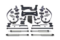 The 8in Performance Suspension System is accomplished via one-piece cast drop down steering knuckles attaching to heavy-duty 1/4in thick, high arched lower control arm crossmembers with tubular upper control arms. Fabtech's combination of steering knuckle, high arched crossmembers and upper control arms provides an excellent ride quality with high ground clearance. This system will provide a true 8 inches of lift without adjustment to the torsion bars allowing the use of 37in tall tires. The front differential is properly relocated to eliminate front driveshaft vibration on 2001-06 vehicles with the stock driveshaft. On late model 2007-08 vehicles with Magna 1625 transfer cases the system requires the use of a CV front driveshaft to address high speed 4WD use. New tubular upper control arms fit into the stock frame pockets using urethane bushings. Upper control arms include double shock mounting tabs for integration with Fabtech's optional front dual shock hoop system. The front suspension is completed with an differential skid plate, tubular crossmember supports and impact struts while the torsion bar drop down brackets properly align the torsion bars to the relocated stock lower control arms. The rear suspension is lifted using a 4'' block kit with 2in add a leafs. The system is completed with rear bump stop brackets and a rear driveshaft carrier bearing drop bracket. Includes front and rear 2.25 Dirt Logic Stainless Steel shocks.