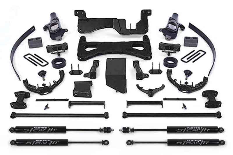 The 8in Performance Suspension System is accomplished via one-piece cast drop down steering knuckles attaching to heavy-duty 1/4in thick, high arched lower control arm crossmembers with tubular upper control arms. Fabtech's combination of steering knuckle, high arched crossmembers and upper control arms provides an excellent ride quality with high ground clearance. This system will provide a true 8 inches of lift without adjustment to the torsion bars allowing the use of 37in tall tires. The front differential is properly relocated to eliminate front driveshaft vibration on 2001-06 vehicles with the stock driveshaft. On late model 2007-08 vehicles with Magna 1625 transfer cases the system requires the use of a CV front driveshaft to address high speed 4WD use. New tubular upper control arms fit into the stock frame pockets using urethane bushings. Upper control arms include double shock mounting tabs for integration with Fabtech's optional front dual shock hoop system. The front suspension is completed with an differential skid plate, tubular crossmember supports and impact struts while the torsion bar drop down brackets properly align the torsion bars to the relocated stock lower control arms. The rear suspension is lifted using a 4'' block kit with 2'' add a leafs. The system is completed with rear bump stop brackets and a rear driveshaft carrier bearing drop bracket.
