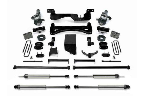 Our 6in system for 2001-10 GM HD's has been designed to provide superior suspension performance for daily driving or for offroad. This is accomplished using our proven one piece lower control arm crossmembers and extended length steering knuckles with 2.25 Dirt Logic stainless steel shocks. The 1/4in thick arched lower control arms crossmembers include an integrated front differential skid plate, crossmembers support tubes and rear impact struts to distribute front suspension impact loads through the frame evenly. A new knuckle design was introduced in 2007 with this system that provides reduced track width to keep the tires under the fenders. This system also includes torsion bar drop mounts, extended length sway bar links with urethane bushings, front and rear bump stop brackets, and rear blocks.