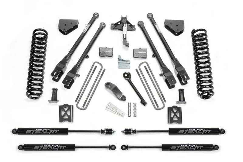 At the top of our Super Duty line is our famous 4 Link System that provides unsurpassed articulation and wheel travel. Large 2'' OD heavy wall links feature race style 1'' Uniballs for superior strength. Thick 1/4'' steel brackets secure the 4 Links to the frame without cutting or welding. This 4 Link system includes our replacement Coil Springs. The system also includes Billet Sway bar links, Trac Bar relocation bracket, Pitman Arm and more. Rear lift is a block & u-bolt kit.