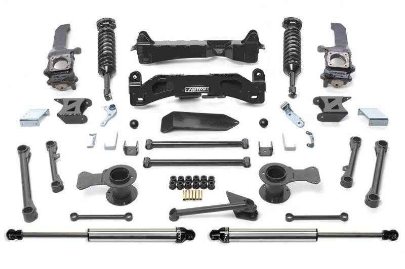 Fabtech's FJ system features extended length steering knuckles attaching to one piece lower control arm crossmembers for a full 6 inches of lift to clear 35in tires. Front lower crossmembers feature adjustable alignment cams along with an integrated 1/4'' thick steel differential skid plate. The Performance system includes Fabtech's Dirt Logic 2.5 Stainless Steel Coilover shocks, replacing the stock front strut assemblies. The rear suspension system includes tubular upper and lower link arms, utilizing the stock rear coil springs for a supple highway ride with excellent offroad articulation. Installation does not require relocation of the Rack and Pinion or disassembly of the front strut assemblies. The stock front and rear driveshafts are retained due to Fabtech's precise suspension geometry. Includes rear 2.25 Dirt Logic Stainless Steel shocks.