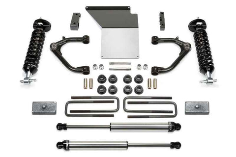 This system offers a mild lift height with easy installation for clearance of 33" tall tires on GM C/K1500s. Lift is accomplished with Dirt Logic 2.5 Coilovers that provide superior damping for aggressive offroad use and a good highway ride. The stock upper control arms are replaced with high quality tubular Uniball arms that allow unrestricted movement throughout the travel range. The arms are constructed of top quality material including .120" wall 4130 Chromoly tubing with a 1.50" OD and 1" FK Stainless PTFE Uniballs. These arms are the best on the market for aggressive offroad driving in harsh conditions. The front differential is relocated to keep CV angles proper with the new lift height while a 1/4" thick steel skid plate provides protection against offroad obstacles. Rear lift is accomplished with 1 1/2" rear lift block and u-bolts to help level the stance of the vehicles. Dirt Logic 2.25 rear shock absorbers replace the stock units for increased damping for both on and offroad use. - Best in class system for aggressive offroad use and good highway ride Increased ground clearance Top quality Uniball Upper Control Arms for aggressive offroad use 1" ID American made FK Uniballs with PTFE for ultimate strength Includes Dirt Logic 2.5 Coilovers for superior damping Increased fender clearance compared to a Leveling Kit for 33" tall tires Suspension can be restored to stock.