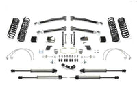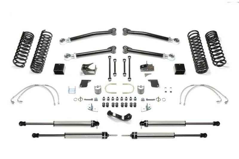 Utilizing the factory link arm mounts Fabtech's Trail short arm suspensions are built for aggressive offroad use while providing a smooth and quite highway ride. Each system has features and benefits that address all variants of off highway travel use including rock crawling, aggressive trail use and overland expeditions. The Trail system replaces the four lower link arms due to their vulnerability to offroad obstacles. Link arms come with large poly urethane bushings on one end with internal threads on the other to accept the ground breaking Fabtech 5 Ton Joint for longevity and a quite ride. System includes dual rate Long Travel coil springs that provide factory load carrying capacity with a smooth ride. The flexible coil design offers an extended travel range for aggressive rock crawling with great highway manners. Includes Lower Short Arm Links Front & Rear, Long Travel Coil Springs Front & Rear, Adjustable Track Bar Front, Sway Bar Links Front, Track Bar Bracket w/ Support Rear, Brake Lines Front & Rear, E Brake Bracket, Front Bump Stop Extensions, Rear Bump Stop Brackets and Dirt Logic 2.25 shocks.
