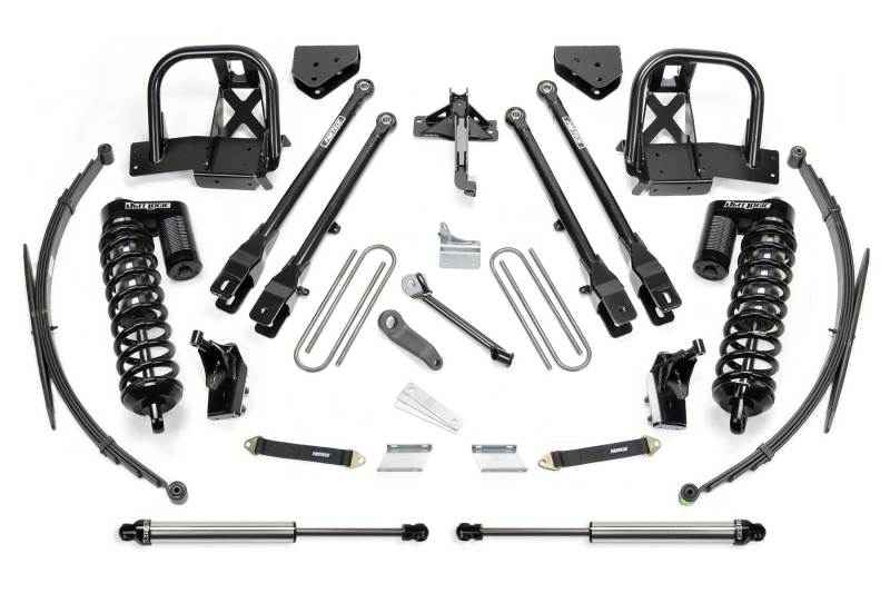 At the top of our Super Duty line is our famous 4 Link System that provides unsurpassed articulation and wheel travel. Large 2'' diameter heavy wall links feature race style 1'' Uniballs for superior strength. Thick 1/4'' steel brackets secure the 4 Links to the frame without cutting or welding. This 4 Link system includes our Dirt Logic 4.0 Stainless Steel Coilover Shock convesion and rear 2.25 Dirt Logic Stainless Steel shocks. The system also includes Sway Bar drops, Trac Bar relocation bracket, Pitman Arm, U-bolt kit, and replacement rear Leaf Springs.