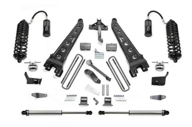 Fabtech's 4" Radius Arm system with the Dirt Logic 4.0 Coilover conversion has been built for the Ford Super Duty to handle the on and offroad demands of the truck enthusiast. This Radius Arm system is a heavy duty upgrade to the factory suspension and will provide additional strength to the vehicle. The heart of this quality system is Fabtech's legendary tubular Radius Arms. The design of these arms comes from Fabtech's racing experience and are built with a tubular structure reinforced by dimple die side plates and heavy gusseting for rugged offroad use. They are superior in strength to the stock stamped arms. A heavy duty Track Bar relocation bracket centers the Super Duty axle under the vehicle and allows for full lock steering of 12.50 wide tires on 5" BS wheels. The front suspension receives the finest shock upgrade on the market with the Dirt Logic 4.0 Coilover conversion. It will provide outstanding damping capacity offroad with a quality on road ride. This Coilover bolts in place of the factory coil spring without removal of the coil spring bucket. The Dirt Logic is constructed with a stainless steel body for maximum corrosion resistance. It comes with a giant 4" diameter aluminum remote reservoir that mounts horizontally above the Coilover to allow for full compression travel with oversized tires. The rear suspension receives a 5" lift block, extended bump stop brackets and Dirt Logic 2.25 shocks for a balanced ride quality. This 4" Radius Arm system with the Dirt Logic 4.0 Coilovers is the ultimate suspension system for Super Duty owners that want to turn heads and tackle the toughest offroad terrain. System includes a free 5 year 60,000 mile powertrain warranty. Each Fabtech component has been designed with specific features and benefits that create this quality suspension system. For a greater understanding of each these components, please see below.