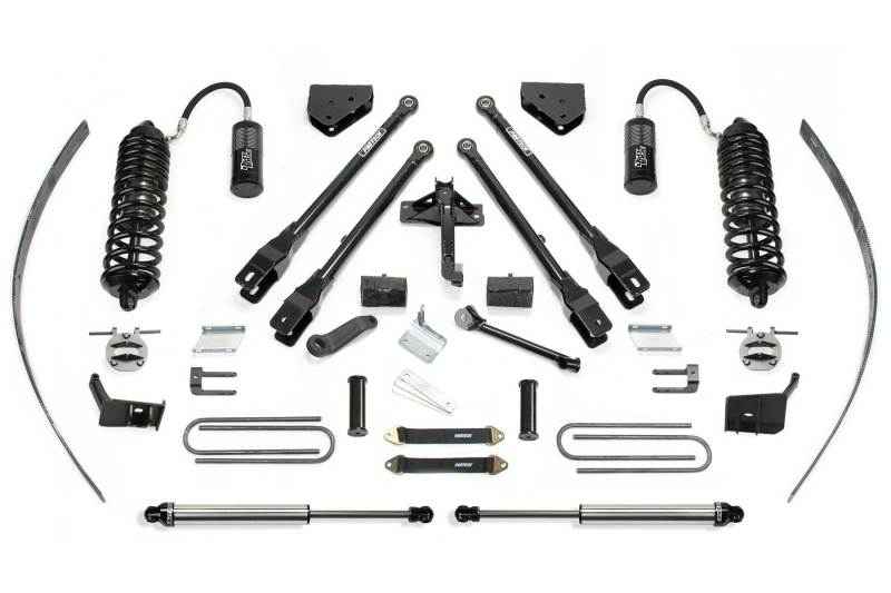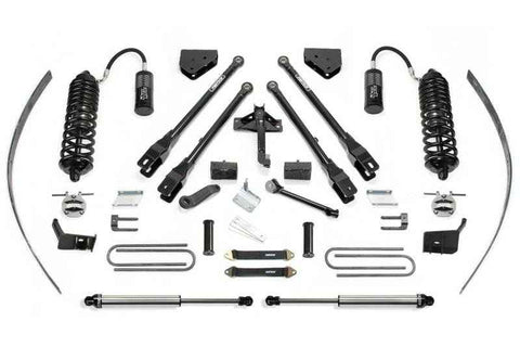Fabtech's 4 Link Conversion system for the Ford Super Duty has been designed to provide improved on road performance with the ability to tackle the most rugged offroad terrain. This high end system is a bolt on replacement to the factory Radius Arm suspension and comes with everything needed to convert to a 4 Link front suspension. The system will provide less caster change throughout the travel range which benefits on road driving. Offroad the 4 Link system will provide more articulation than a Radius Arm for increased terrain traversing at all speeds. Included in this system is the massive Dirt Logic 4.0 Coilover Conversion for outstanding damping capacity offroad with a quality on road ride. The Coilover bolts in place of the factory coil spring without removal of the coil spring bucket. The giant 4?? diameter aluminum remote reservoir mounts horizontally above the Coilover to allow for full compression travel with oversized tires. The Dirt Logic 4.0 Coilover is the biggest and baddest on the market for the Ford Super Duty. Fabtech?'s 4 Link System has been proven in over 10 years of service in military applications. High quality components with properly designed suspension geometry is the pinnacle of Super Duty suspension systems. System includes a free 5 year 60,000 mile powertrain warranty.