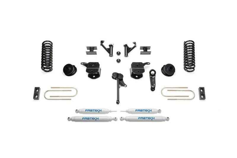 Fabtech's new Coil Spring Suspension Systems for late model Ram 3500 trucks will provide a smoother on road ride than factory with the ability to handle heavy loads and rough offroad use. As an industry exclusive Fabtech utilizes front coil springs with a straight spring design and patent pending angled lower mounts that produces a very smooth ride compared to stock. The factory springs are a high rate bowed style that naturally rides stiff with an overactive response to varying road conditions. Fabtech's straight design has a lower spring rate that provides a smoother ride yet still retains the factory carrying capacity of the vehicle when required. No other Ram suspension system can offer this. Fabtech's front straight coil springs will provide a noticeable ride quality improvement of the vehicle compared to stock.