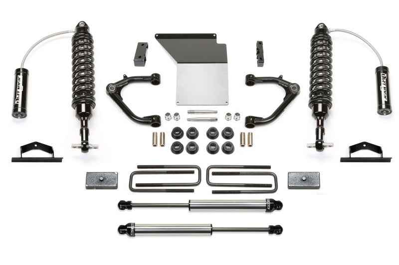 This system offers a mild lift height with easy installation for clearance of 33'' tall tires on 2014-15 K1500's w/ factory Aluminum suspension. Lift is accomplished with Dirt Logic 2.5 Coilovers that provide superior damping for aggressive offroad use and a good highway ride. The stock upper control arms are replaced with high quality tubular Uniball arms that allow unrestricted movement throughout the travel range. The arms are constructed of top quality material including .120'' wall 4130 Chromoly tubing with a 1.50'' OD and 1'' FK Stainless PTFE Uniballs. These arms are the best on the market for aggressive offroad driving in harsh conditions. The front differential is relocated to keep CV angles proper with the new lift height while a 1/4'' thick steel skid plate provides protection against offroad obstacles. Rear lift is accomplished with 1 1/2'' rear lift block and u-bolts to help level the stance of the vehicles. Dirt Logic 2.25 rear shock absorbers replace the stock units for increased damping for both on and offroad use. -Best in class system for aggressive offroad use and good highway ride -Increased ground clearance -Top quality Uniball Upper Control Arms for aggressive offroad use -1'' ID American made FK Uniballs with PTFE for ultimate strength -Includes Dirt Logic 2.5 Coilovers for superior damping -Increased fender clearance compared to a Leveling Kit for 33'' tall tires -Suspension can be restored to stock. NOTE- Before ordering visually check your vehicle's factory suspension for aluminum or steel version. This system will only fit factory aluminum suspension vehicles.