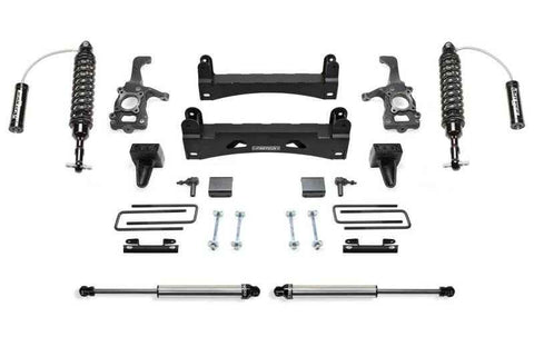 This system feature Fabtech?s proven IFS technology with extended length ductile iron steering knuckles for proper Ford electronic stability control functionality. Heavy duty 1/4? thick steel lower control arm crossmembers provide superior ground clearance for adventurous offroad trails. Rear lift is accomplished with a 2.25? lift block and extended length u bolts. The Performance system includes Fabtech?s legendary stainless steel Dirt Logic 2.5 Coilover shocks for outstanding damping capacity with a great highway ride. Rear shocks include the Dirt Logic 2.25. This high quality system does not require drilling or cutting for installation and comes Fabtech?s 5/60 Powertrain warranty. 1/4? thick steel lower control arm crossmembers are arched for maximum ground clearance. Four adjustable alignment cams provide a wide range of adjustment. The fully welded box design of these crossmembers provides additional strength to the front suspension. Extended length ductile iron steering knuckles retain near stock track width keeping the tires under the fenders. These steering knuckles are designed to work in conjunction with the Ford ESC for proper functionality at all speeds. Brake Line Brackets reposition the factory Ford brake lines down on the frame for the new travel range without having to open the brake system. Keeps factory fluid system intact. 1/4" thick steel drop brackets reposition the front sway bar for the increased ride height. This allows the sway bar link ends to fully cycle without binding throughout the extended travel range. 5" Tall rear lift blocks replace the factory blocks without changing the ride quality or load carrying capacity. American made U Bolts that retain the entire rear differential to the vehicle. A critical part that demands the best quality for your vehicle.