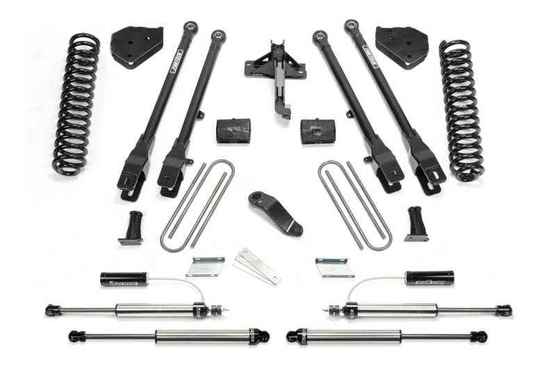 Fabtech's 4 Link Conversion system for the Ford Super Duty has been designed to provide improved on road performance with the ability to tackle the most rugged offroad terrain. This high end system is a bolt on replacement to the factory Radius Arm suspension and comes with everything needed to convert to a 4 Link front suspension. The system will provide less caster change throughout the travel range which benefits on road driving. Offroad the 4 Link system will provide more articulation than a Radius Arm for increased terrain traversing at all speeds. Include with this system is Dirt Logic 2.25 Stainless Steel reservoir shocks in the front and non reservoir shocks in the rear. These Dirt Logic shocks have been ride tuned to the vehicle with the Fabtech Coil Springs and oversized tires for an excellent ride quality both on and offroad. Fabtech's 4 Link System has been proven in over 10 years of service in military applications. High quality components with properly designed suspension geometry is the pinnacle of Super Duty suspension systems. System includes a free 5 year 60,000 mile powertrain warranty.