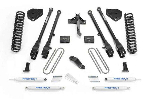 Fabtech?s 6? 4 Link Conversion system for the Ford F450 and F550 Super Duty is built to handle the on and offroad demands of the truck enthusiast. 2? OD Heavy wall link arms have 1/4? thick steel brackets at the axle with adjustable alignment cams and Fabtech?s legendary 5 Ton joints to pivot at the frame for an extended service life. The 4 Link Arms attach to stout 1/4? thick steel frame brackets for a solid mounting of the new suspension. American made coil springs have been designed for a very compliant ride quality both on and offroad. 1/4? thick steel bracketry repositions the factory track bar to center the axle under the vehicle with the increased lift height. Super stout box style bracket is designed to eliminate deflection when the track bar moves through its full cycle. The Dropped Pitman Arm uses forged steel construction with high strength material that exceeds the factory specifications. Heavy duty 1/4" thick steel brackets control the travel eliminating over cycling of the suspension. Super strong construction can handle the full compression impact of the F450 or F550. 1/4" thick steel drop brackets reposition the front sway bar for the increased ride height. This allows the sway bar link ends to fully cycle without binding throughout the extended travel range. Brake Line Brackets reposition the factory brake lines down on the frame for the new travel range without having to open the brake system. Retains the factory F450 or F550 long travel steering stabilizer with a 1/4" thick steel bracket and support brace to help reduce tire shimmy. Steel rear lift blocks replaces the factory blocks for additional lift without changing the ride quality or load carrying capacity. American made U-Bolts designed to attach the entire rear differential to the vehicle. Extended length Performance twin tube shocks provide a good highway ride with the ability to handle offroad use.
