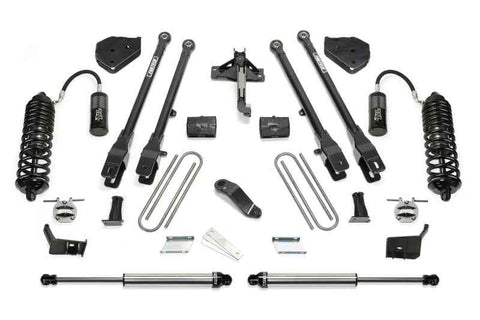 Fabtech?s 6" 4 Link Conversion system for the Ford F450 and F550 Super Duty is built to handle the on and offroad demands of the truck enthusiast. This vehicle?s suspension is more robust than the Ford F250 and F350 and therefore demands specialty parts only available from Fabtech. This system comes with everything needed to convert to a 4 Link front suspension. The system will provide less caster change throughout the travel range which benefits on road driving. Offroad the 4 Link system will provide more articulation than a Radius Arm for increased terrain traversing at all speeds. Fabtech?s 4 Link System has been proven in over 10 years of service in consumer, commercial and military applications. High quality components with properly design suspension geometry is the pinnacle of Super Duty suspension systems. Each Fabtech component is expertly built in house and has specific design features and benefits as listed below. FEATURES: LINK ARMS & BRACKETS - 2" OD Heavy wall link arms have 1/4" thick steel brackets at the axle with adjustable alignment cams and Fabtech?s legendary 5 Ton joints? to pivot at the frame for an extended service life. The 5 Ton joints? have been proven in military use for over 10 years and are quiet and strong. The 4 Link Arms attach to stout 1/4" thick steel frame brackets for a solid mounting of the new suspension. The geometry of the 4 Link arms and frame brackets has been designed to provide an improved highway ride due to reduced caster change and able to tackle rough offroad conditions better than a Radius Arm suspension. DIRT LOGIC 4.0 CONVERSION - Simplistic super stout 1/4" thick steel brackets utilize the factory coil bucket to bolt in the big Dirt Logic 4.0 Coilover. A massive 4" diameter stainless steel body with 1.25 NitroSteel? piston rod for maximum corrosion resistance and durability for the most aggressive driving conditions. American made coil springs handle the weight of the F450 or F550 and provide a superior ride