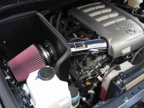 The K&N 77-9031-1KP high-flow performance air intake system is a free-flowing, mandrel-bent aluminum tube air induction system designed to fit some Toyota Tundra and Sequoia models. The restrictive factory air filter and air intake housing on your vehicle are replaced by this K&N air intake system which is designed to dramatically reduce air flow restriction as it smoothes and straightens air flow. The improved air flow allows your engine to inhale a larger amount of air than it would from the stock air intake. More air means more usable power and acceleration throughout your engine's RPM range. The 77-9031-1KP air intake comes with a chrome topped K&N high-flow air filter and a heat shield that installs into the previous air box space. Air is directed through the intake tube into the engine's throttle body for a guaranteed power gain. The intake tube has an attractive chrome-like finish that's made to last and it accommodates the factory mass air sensor, fuel pressure vent hose and crank case vent hose. The oversized cone shaped air filter can be used for up to 100,000 miles before servicing is needed depending on driving conditions. This air intake is relatively easy to install usually in 90 minutes or less using existing factory mounting points. The tools needed are a couple of screwdrivers, a ratchet set and some wrenches. Some K&N 77 series air intakes are not legal for sale or use in California and other states adopting California emission standards while others are CARB exempt and 50 state legal. Check the K&N catalog or website for vehicle applications and specific CARB status for each vehicle and air intake.
