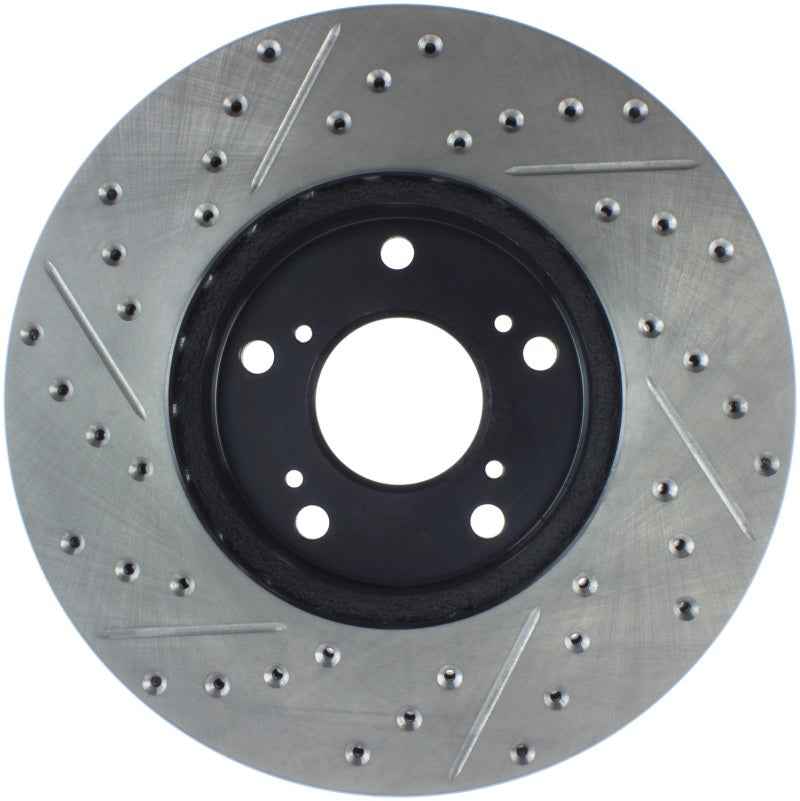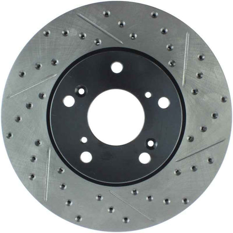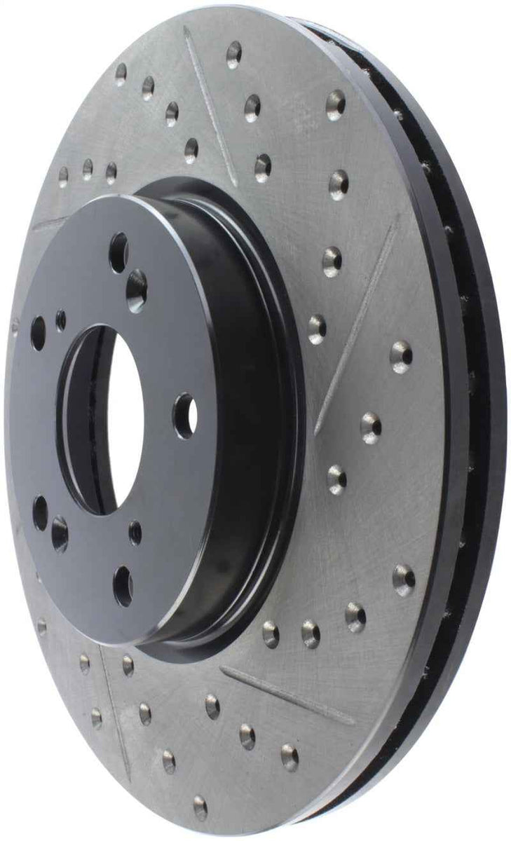 StopTech Drilled and Slotted Sport Rotors are 1-piece direct replacement brake discs for factory brake systems and stock calipers that look great behind your wheels – and offer significantly improved braking performance. The unique cross-drilling and slotting aids with heat and brake dust dispersal, prevents glazing of the pads, adds bite and improves wet and dry braking performance. Built to last, the black e-coating provides protection from corrosion and the high carbon metallurgy (in most applications) offers quieter operation, better crack resistance and increased performance.