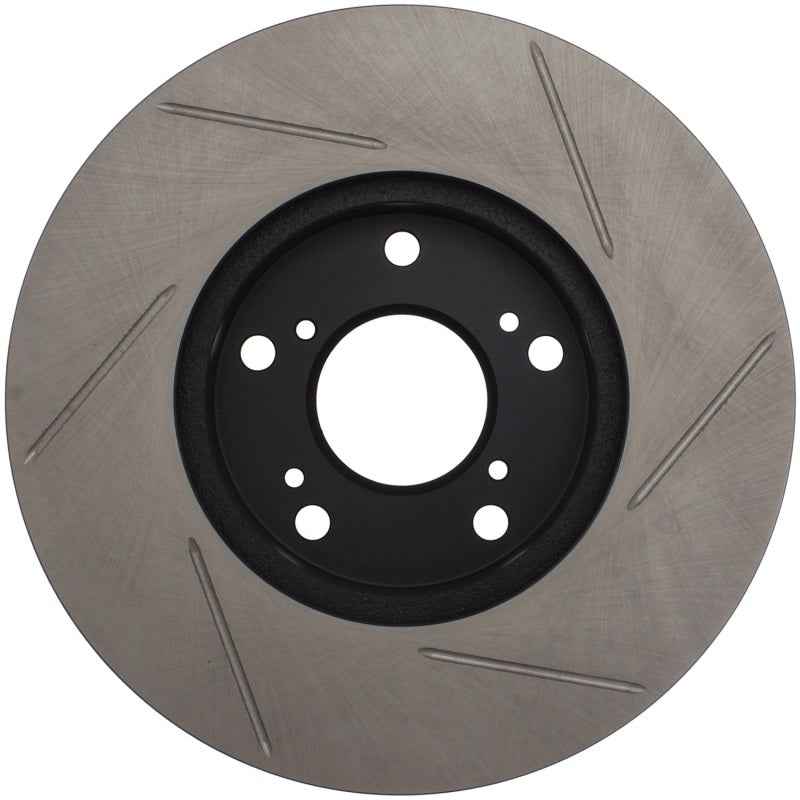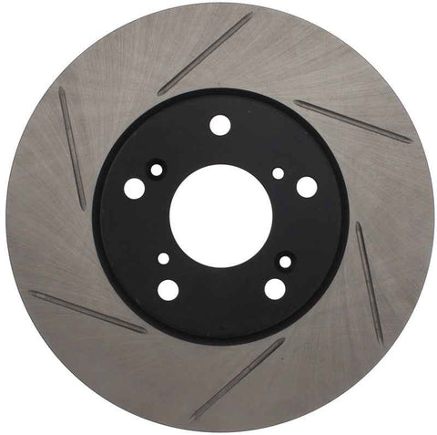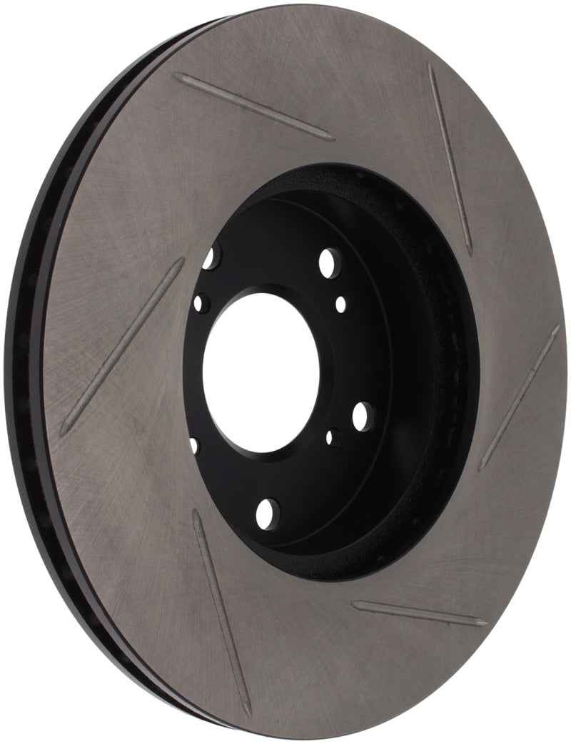 StopTech Slotted Sport Rotors are 1-piece direct replacement brake discs for factory brake systems and stock calipers that look great behind your wheels – and offer significantly improved braking performance. The unique slotting aids with heat and brake dust dispersal, prevents glazing of the pads, adds bite and improves wet and dry braking performance. Built to last, the black e-coating provides protection from corrosion and the high carbon metallurgy (in most applications) offers quieter operation, better crack resistance and increased performance.
