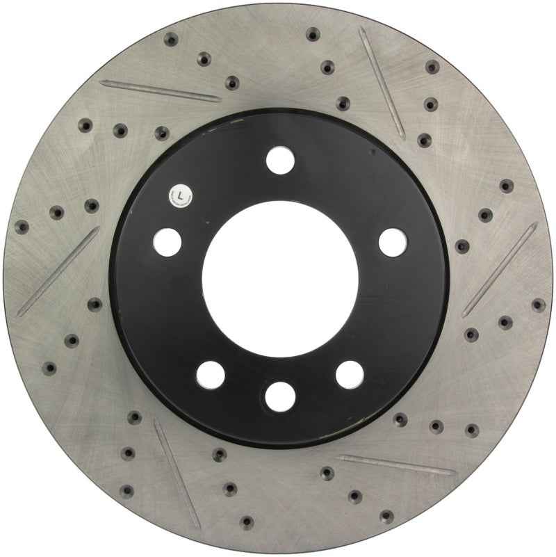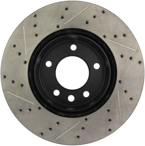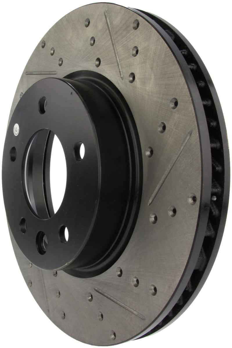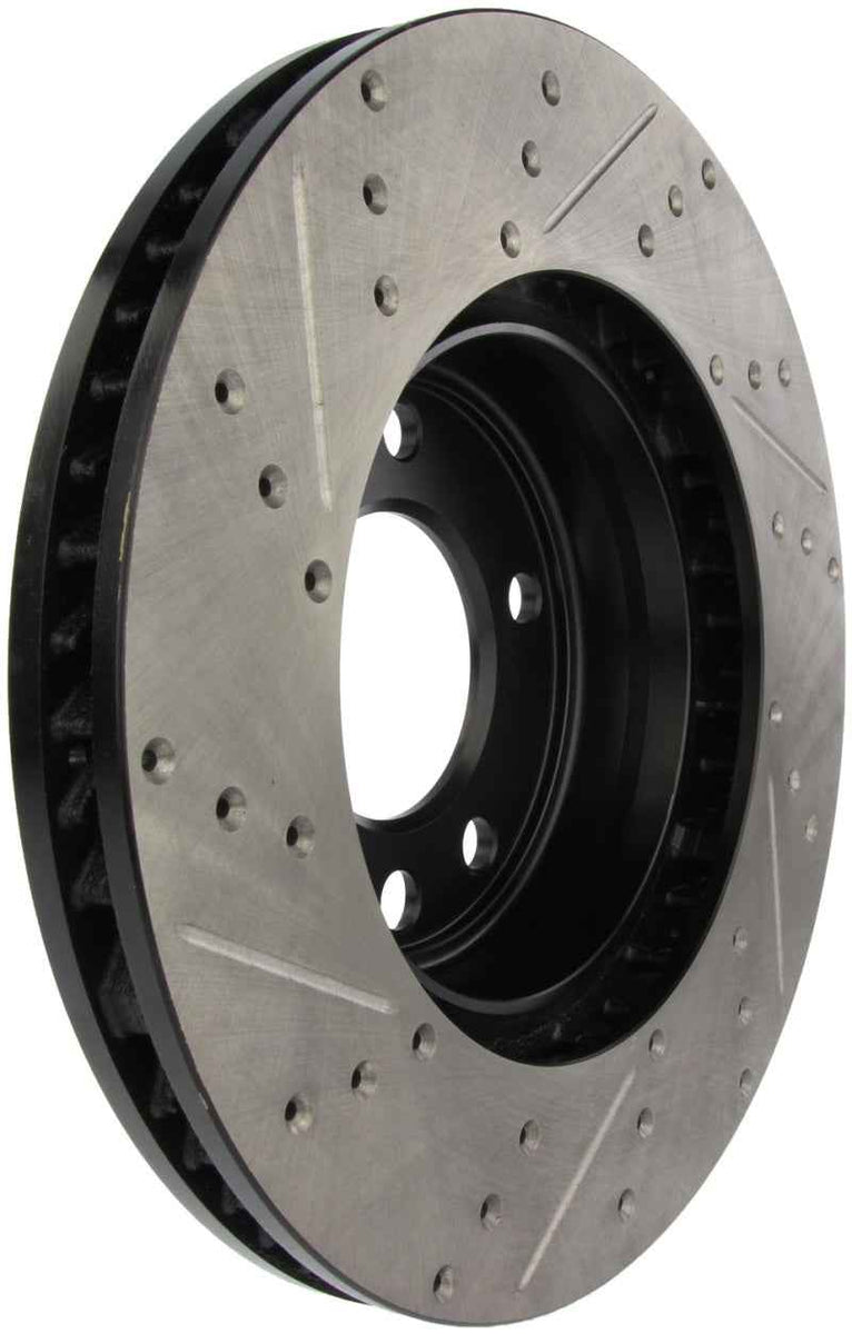 StopTech Drilled and Slotted Sport Rotors are 1-piece direct replacement brake discs for factory brake systems and stock calipers that look great behind your wheels – and offer significantly improved braking performance. The unique cross-drilling and slotting aids with heat and brake dust dispersal, prevents glazing of the pads, adds bite and improves wet and dry braking performance. Built to last, the black e-coating provides protection from corrosion and the high carbon metallurgy (in most applications) offers quieter operation, better crack resistance and increased performance.