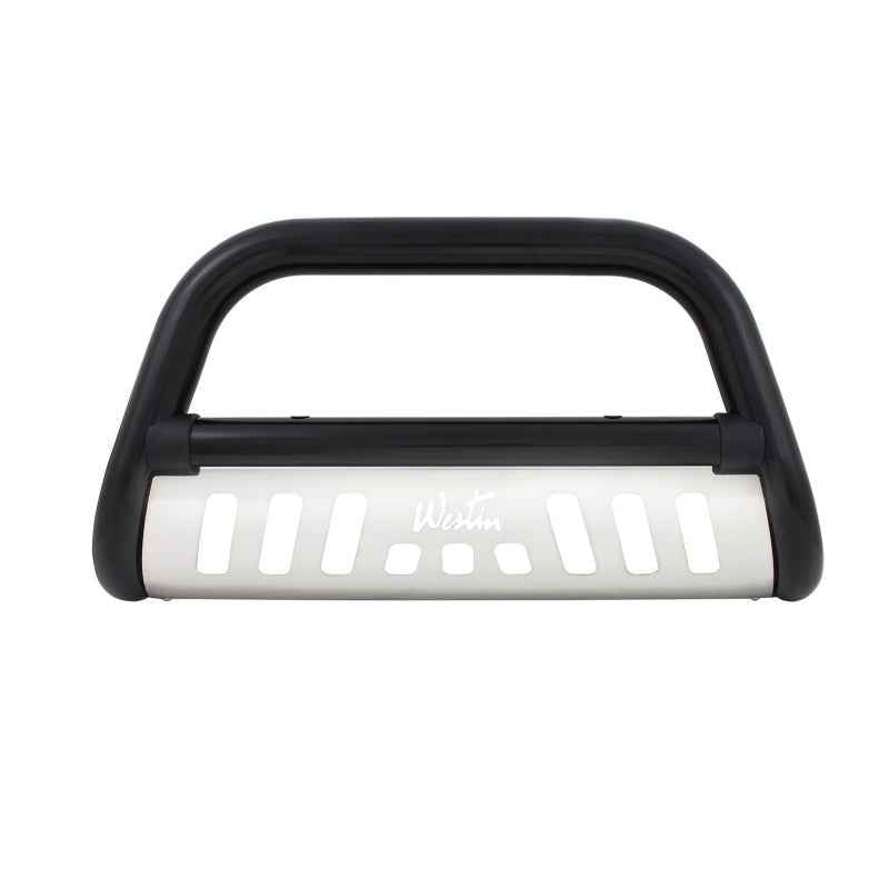The Westin(TM) Ultimate Bull Bar is a front-end light bar made of 3in. diameter tubing for larger model trucks and SUVs and made of 2.5in. diameter tube for smaller trucks and SUVs. Product application is vehicle specific and comes complete with mounting kit. The Westin(TM)Ultimate Bull Bar features black molded caps on the crossbar welds for a finished and clean look. It features a stainless steel skid plate with a laser-cut Westin signature logo on it. Add a set of Westin(TM) Driving Lights for a complete customized look.