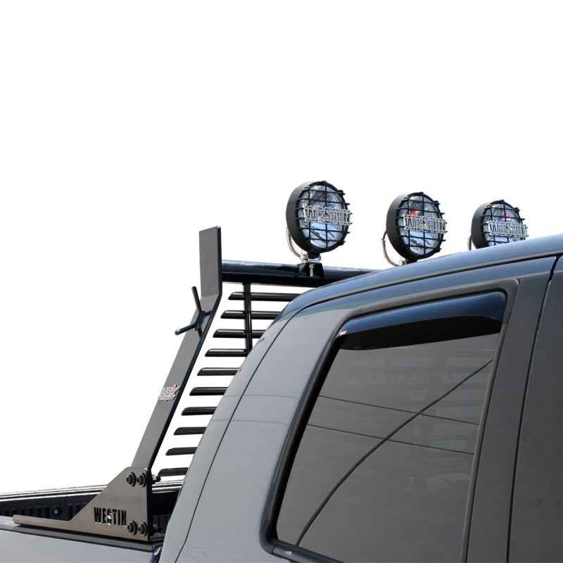 HDX Commercial Grade Headache Rack protects your rear window from potential damage from shifting cargo. Welded tie-off hooks for securing your load are standard on all applications. Angled louvers keep sunlight out the cab cool and prevent UV damage to your interior all while allowing unobstructed visibility. 4 mount tabs give you the option of adding safety lights or accessories. Accommodates all major brand tool boxes. 2 diameter round top tube makes it easy to slide ladders