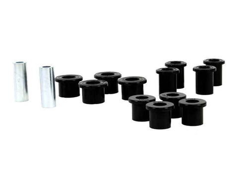 All in one leaf spring bushing service kit covering front and rear eyes of the leaf plus shackle bushings. High kilometres and heavy load carrying causes excessive wear on rubber bushings. Whiteline's signature black bushings are made tough and offer outstanding abrasion resistance, high load bearing capability (4WD's, utes and towing), flexibility, increased tensile strength and chemical resistance to oil, grease, ozone and weathering.