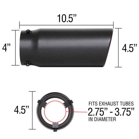 Designed to fit 2.75 to 3.75 inch exhaust tubing; this universal exhaust tip has a 4.5 inch diameter body; slant cut opening and is held in place by 3 screws or by tack welding.