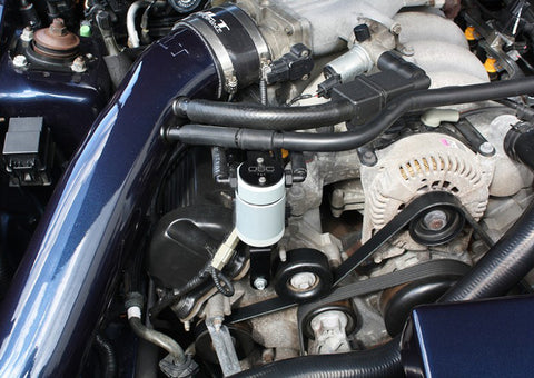 During the process of venting crankcase pressure back through your intake track, large amounts of oil, in the form of vapors can gather/accumulate in your intake tube, intake manifold runners and even dilute your gas, lowering its octane level. This happens on all engines and is even worse with forced inducted vehicles (supercharged and turbocharged) as crankcase pressures are increased. To combat this, we have developed an oil separator of our own design. Milled from solid billet aluminum this is a rock-solid piece. It has a knurled tank base for easy removal to drain the spent oil and an O-ring seal to prevent any leaks.