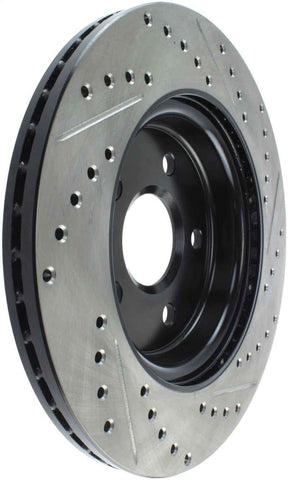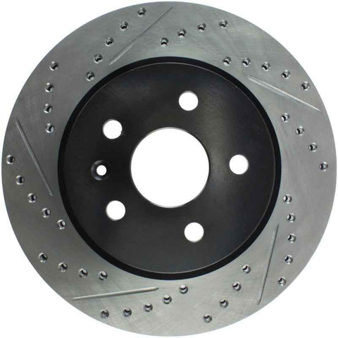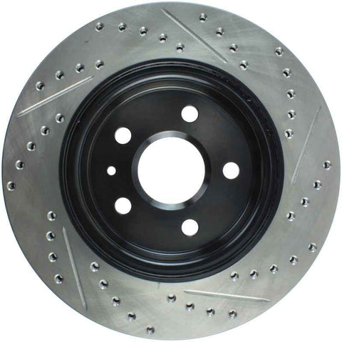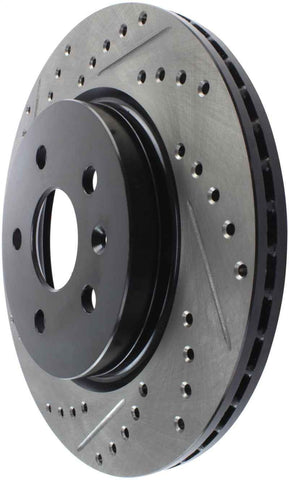 StopTech Drilled and Slotted Sport Rotors are 1-piece direct replacement brake discs for factory brake systems and stock calipers that look great behind your wheels – and offer significantly improved braking performance. The unique cross-drilling and slotting aids with heat and brake dust dispersal, prevents glazing of the pads, adds bite and improves wet and dry braking performance. Built to last, the black e-coating provides protection from corrosion and the high carbon metallurgy (in most applications) offers quieter operation, better crack resistance and increased performance.