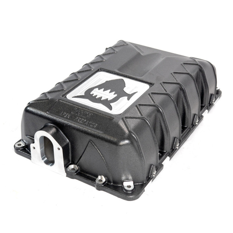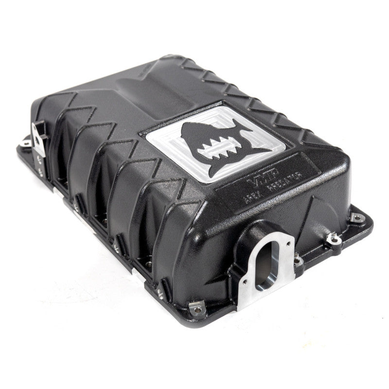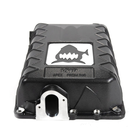 Apex Predator Supercharger Lid Upgrade for Fords 2020+ Predator engine. We have upgraded our black finish to a Metallic Black that looks great under the hood. No stranger to supercharger technology, VMP has spent countless hours developing a lid upgrade that will make real-world differences in power and performance. What the company arrived at was a patent-pending design that improves high-RPM airflow. In turn, airflow limitations of the stock blower are eliminated. Furthermore, the lid is compatible with a variety of intercoolers, including the stock intercooler, VMP"s 81 mm Race Intercooler and VMP"s upcoming Apex Intercooler Upgrade. When coupled with VMP"s intercooler upgrades, it controls the inherently high intake air temperatures common when modifying the stock supercharger. The lid is packed with additional features. The lid fits under the stock strut-tower brace to maintain a factory-like appearance. The lid features a boost reference port for the most accurate data collection. Additionally, the lid includes eight 1/8th inch NPT ports. These ports are for the true horsepower junkie, allowing nitrous or water-methanol direct injection for ultimate horsepower gains. For those GT500 owners looking to go as fast as possible, the lid is 1.5 pounds lighter than the stock lid. The company saw 20 rearwheel horsepower gains with the lid alone, and 40 rearwheel horsepower when the lid was coupled with their upgraded intercooler. VMP's Apex Predator Line of upgrades is for Ford's 2020+ Predator engine, featured in the 2020+ GT500 and the 2023 Raptor.