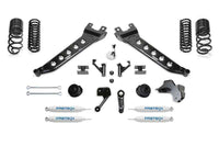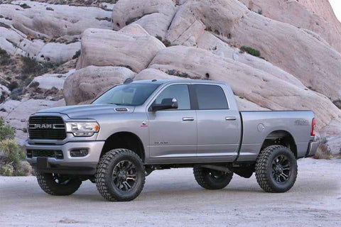 Improving on the Ram suspension design, Fabtech offers their trademark Radius Arms in a complete lift kit system. These exclusive tubular Radius Arms have recognizable dimple die side plates for superior strength and a signature of quality. The rugged Arms provide increased caster for use with oversized tires and lifted suspension heights. The factory front Ram coil spring has a noticeable bow to it with a very high spring rate for the weight rating of the vehicle. This creates a harsh ride with a nervous feel from the suspension. To correct this, Fabtech uses a straight vertical coil design. In order to utilize a straight coil, the lower spring seat mount must be modified via a Fabtech patented angular spring mount that attaches to the stock seat. This eliminates the bow to the spring and allows for a lower rate with a straight coil for a supple ride without sacrificing load carrying capacity. A Fabtech exclusive. For the rear, this lift kit has the perfect balance between ride quality and retaining the factory carrying capacity. By utilizing a dual rate spring design, it provides a good highway ride in the first stage of compression and then the second stage handles heavy loads. Heavy duty 1/4" thick steel front and rear Track Bar drop brackets center the axles under the vehicle with the new ride height. A Fabtech innovation with this Ram lift kit is the heavy duty steel front bump extensions. They retain the stock bump stop cushions for progressive damping and will not allow the suspension to over travel. This is a superior feature compared to replacement long length urethane bump stops as they can push out under harsh conditions. FEATURES: Fabtech?s trademark Radius Arms with recognizable dimple die side plates providing additional strength and increased caster. Front straight Coil Springs with Fabtech?s patented angled mounts for smooth ride. Heavy duty Track Bar drop brackets center the axles under vehicle for proper tracking. Dual rate rear coil spri