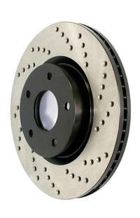 StopTech Drilled Sport Rotors are 1-piece direct replacement brake discs for factory brake systems and stock calipers that look great behind your wheels – and offer significantly improved braking performance. The unique cross-drilling aids with heat and brake dust dispersal, prevents glazing of the pads, adds bite and improves wet and dry braking performance. Built to last, the black e-coating provides protection from corrosion and the high carbon metallurgy (in most applications) offers quieter operation, better crack resistance and increased performance.