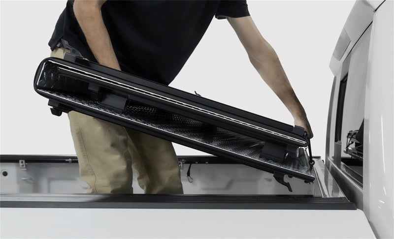 LOMAX(TM) Hard Tri-Fold Cover delivers a bold look, taking your truck to new heights. The textured matte black finish and ultra low profile design merge flawlessly with your pickup for a sleek appearance. From the simple install and removal to the strategically placed weather seals, the LOMAX(TM) Hard Tri-Fold Cover is manufactured for superior performance. No such thing as too much detail.